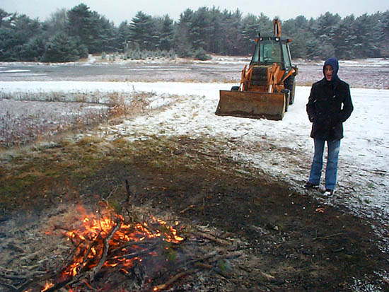 Ted marched off to start clearing more underbrush, while I (in my $10 jeans, wool sweater, chamois shirt and trucker's hat) stayed behind to tend the fire with a rake and pitchfork. It was comfortable work. As the fire grew warmer, I thought about last Sunday's all-day Superbowl party at Dave's house, complete with our keg of Boston Ale, the video games we played, the batches of homemade chili that Adam and I had each brought, the Pats' incredible victory, the superbowls we smoked by the heat from the wood stove. A great end to a great weekend that seemed far away.