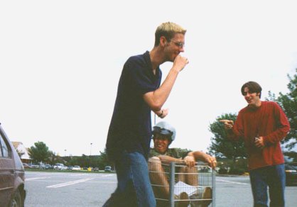 Daniel laughs, pointing. Ryan laughs, moving. Jonas experiences pain.